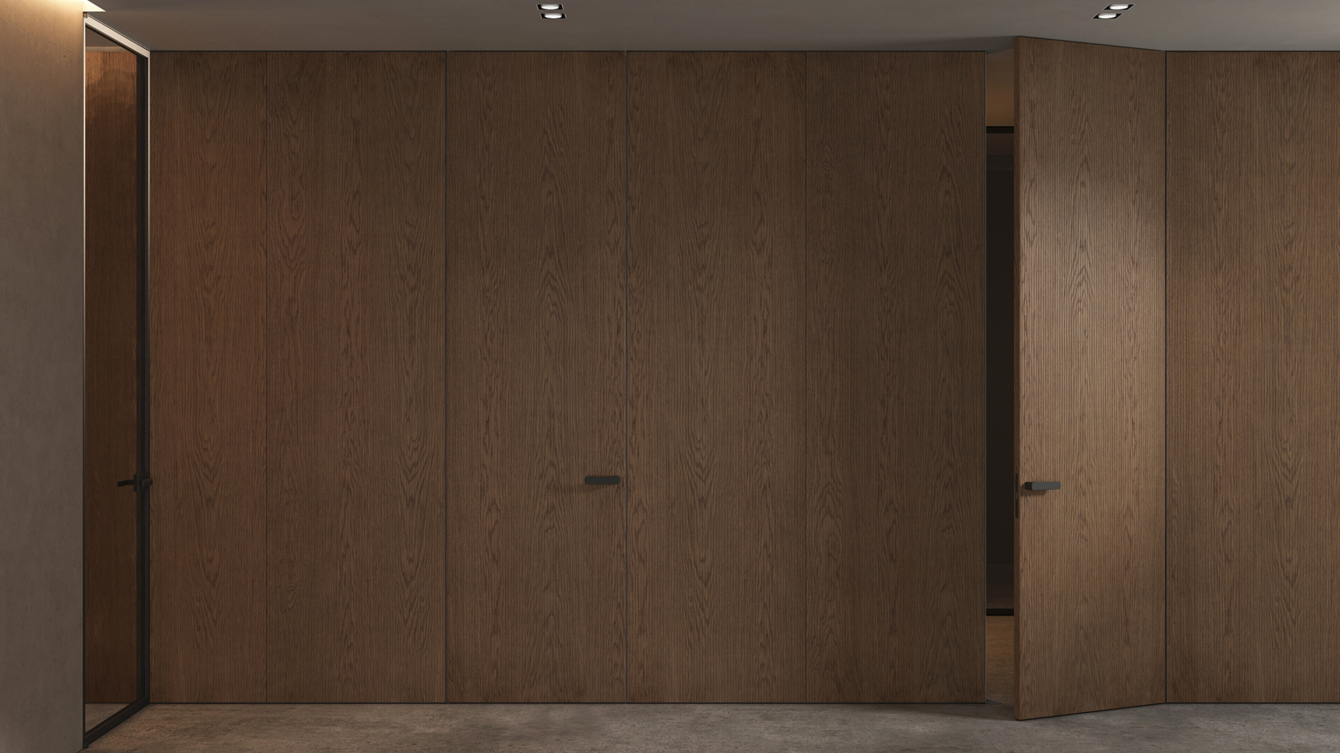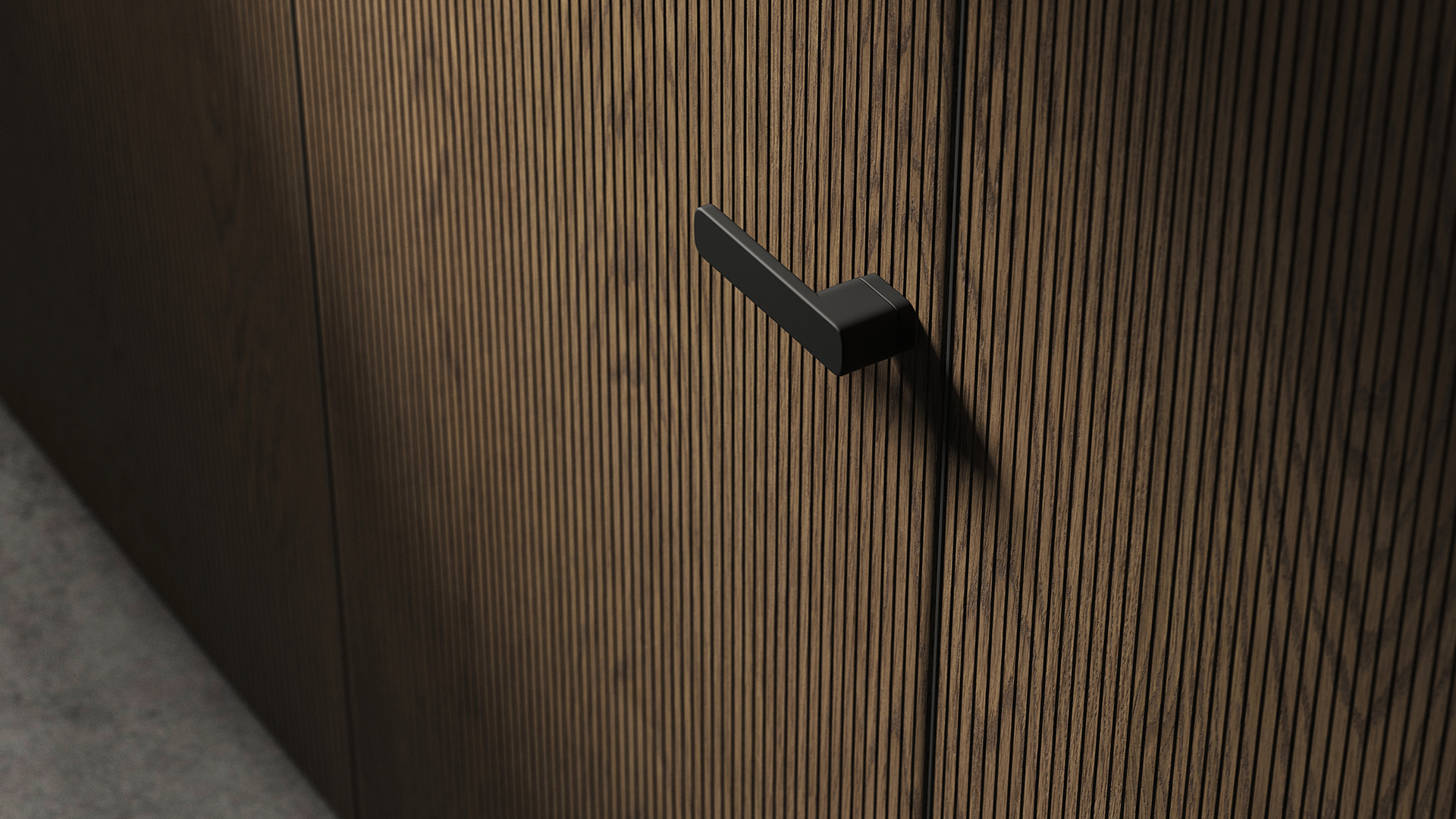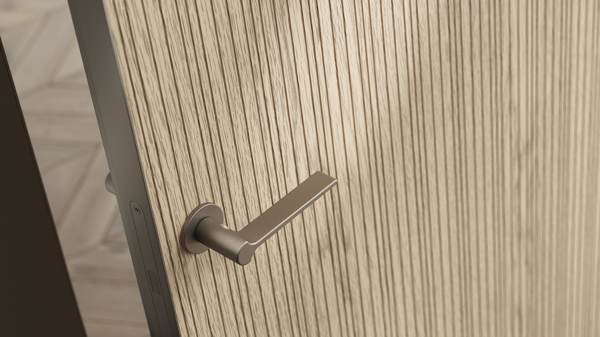 Селект — коллекция минималистичных дверей с фрезеровкой по натуральному шпону. Рельеф на поверхности полотна создаёт игру света и тени, добавляя пространству динамичности и визуального объёма. Двери Селект в сочетании со стеновыми панелями и мебельными фасадами, повторяющими лаконичный дизайн, создают единое стилевое решение.