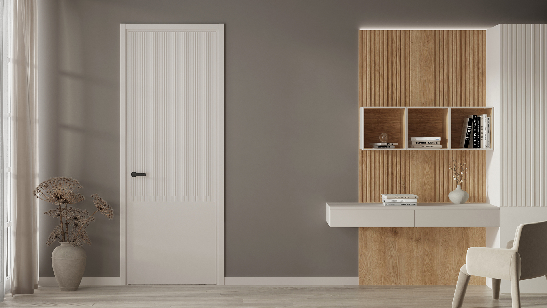 Дюна — коллекция дверей украшена частой прямой фрезеровкой, которая напоминает волны дюн в пустыне. Созданная на поверхности полотна текстура привлекает взгляд и добавляет глубину пространству. Двери Дюна — это сочетание современного дизайна и вдохновения живописными природными ландшафтами.