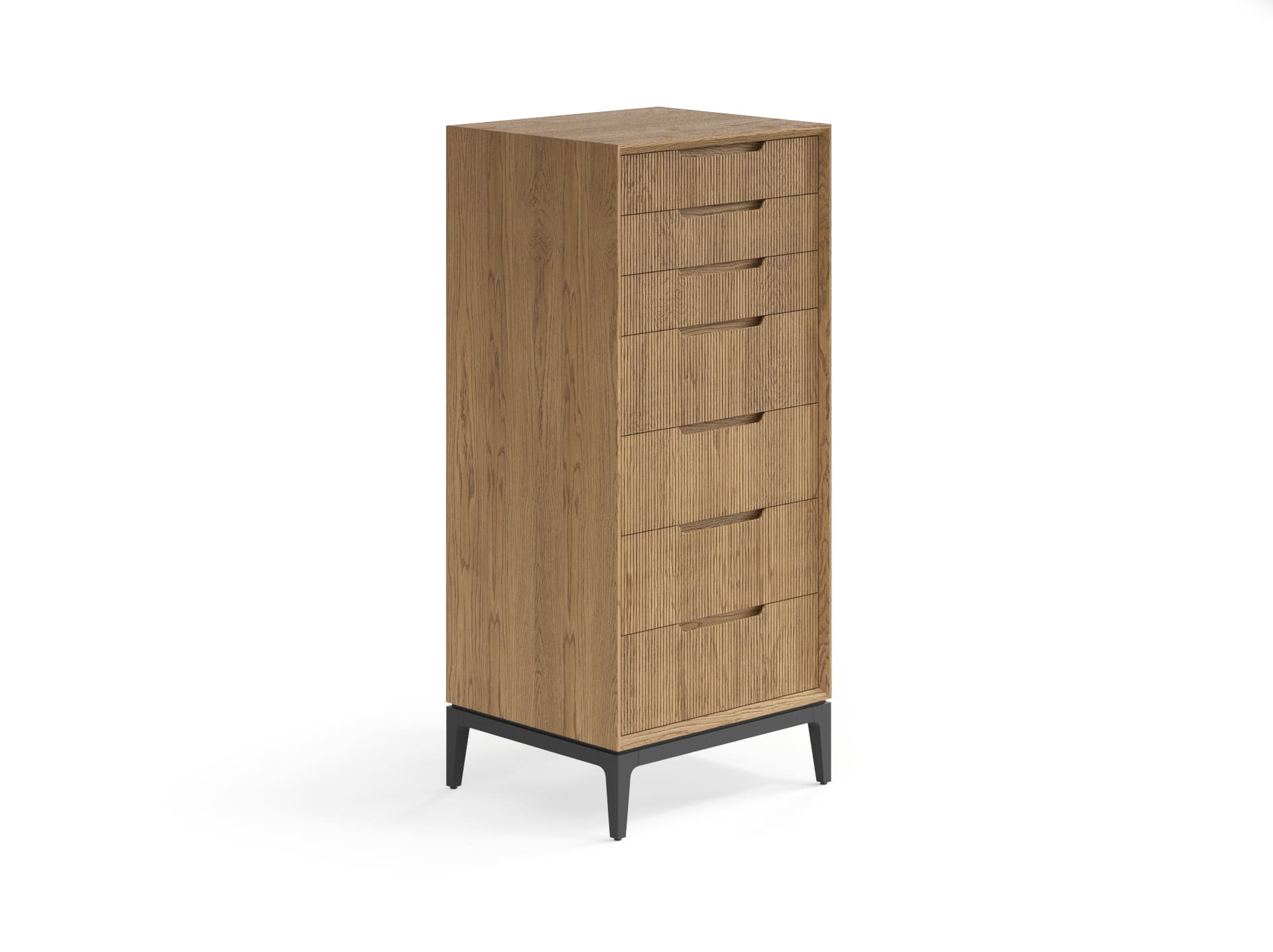 Изделие лаконичной формы внесёт в пространство спокойствие и надёжность, а рельефная фрезеровка на фасаде добавит индивидуальность. Благодаря скрытым направляющим выдвижных ящиков вид изделия остаётся безупречным всё время пользования. Количество циклов открывания и закрывания — 80 000. Это значит, что если вы будете пользоваться комодом дважды в день, изделие будет оставаться в идеальном рабочем состоянии и радовать вас примерно 55 лет.