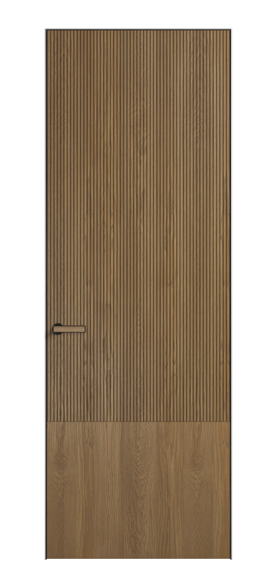 Это полотна с рельефной фрезеровкой. Этот прием делает интерьер объемным, тактильным, вносит интересную текстуру и создает современный образ. Волнистый рельеф может быть выполнен по ламелям из массива дуба в древесных матовых отделках, либо исполнен по натуральному и экологически безопасному материалу — ХДФ, покрытому гладкой эмалью актуальных оттенков.