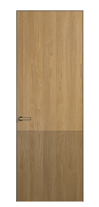 Это полотна с рельефной фрезеровкой. Этот прием делает интерьер объемным, тактильным, вносит интересную текстуру и создает современный образ. Волнистый рельеф может быть выполнен по ламелям из массива дуба в древесных матовых отделках, либо исполнен по натуральному и экологически безопасному материалу — ХДФ, покрытому гладкой эмалью актуальных оттенков.